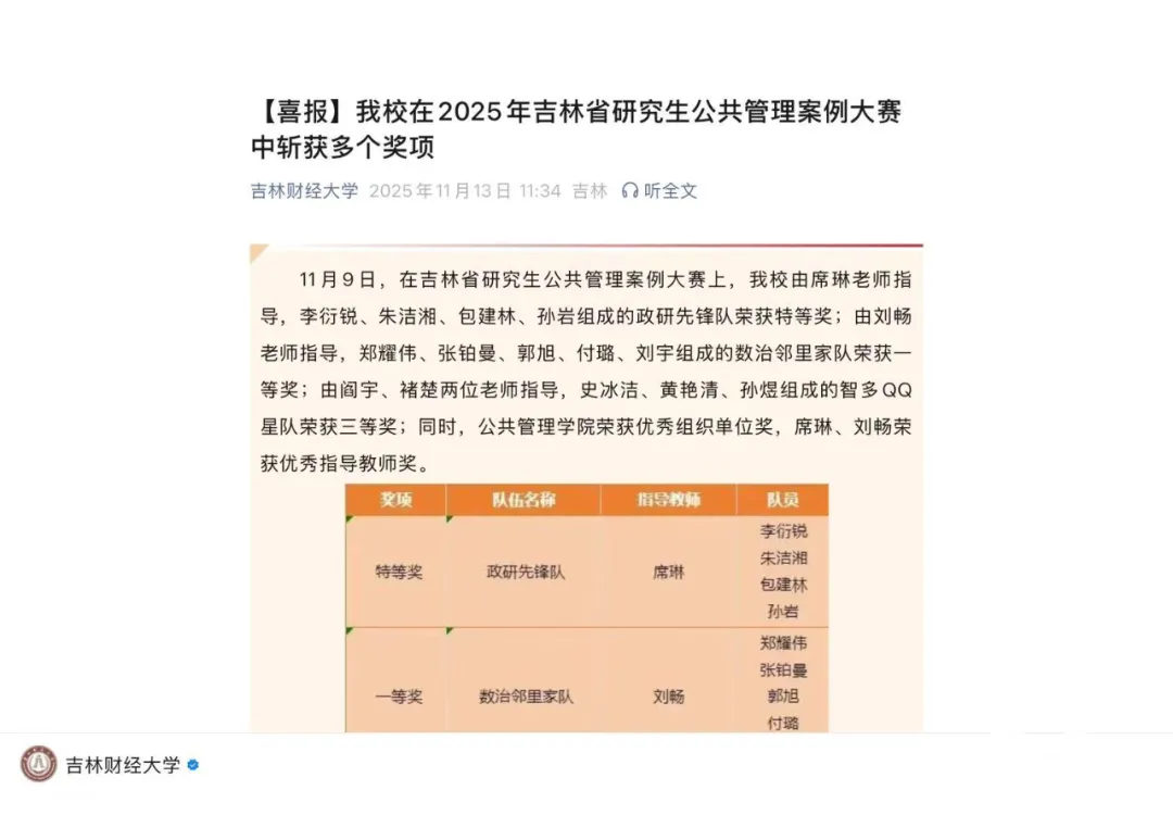 (通讯员:李青凡)11月9日,在吉林省研究生公共管理案例大赛上,我院由席琳老师指导,李衍锐、朱洁湘、包建林、孙岩组成的政研先锋队荣获特等奖;由刘畅老师指导,郑耀伟、张铂曼、郭旭、付璐、刘宇组成的数治邻里家队荣获一等奖;由阎宇、褚楚两位老师指导,史冰洁、黄艳清、孙煜组成的智多QQ星队荣获三等奖;同时,公共管理学院荣获优秀组织单位奖,席琳、刘畅荣获优秀指导教师奖。