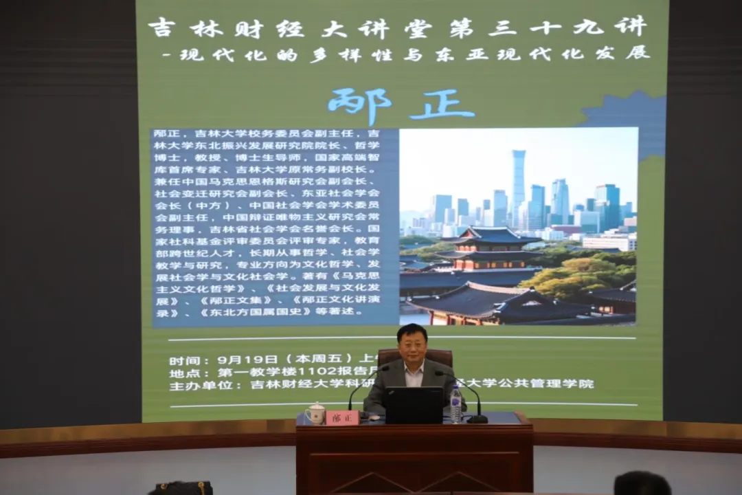 受吉林财经大学科研处及公共管理学院邀请,吉林大学校务委员会副主任、东北振兴发展研究院院长、博士生导师邴正教授作了《现代化的多样性与东亚现代化发展》主题学术报告。邴正教授担任国家高端智库首席专家等多项学术职务,长期致力于文化哲学、发展社会学与文化社会学的研究。报告由吉林财经大学公共管理学院院长李阳主持,李阳院长代表主办方对邴正教授的到来表示热烈欢迎。